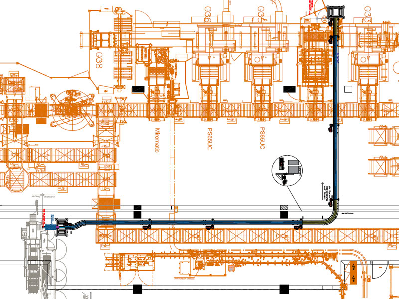 Von dort aus werden die Kartonagen in einen Höhenförderer von Profipack übernommen und entlang der Decke zu einer bestehenden Palettierung gefördert.